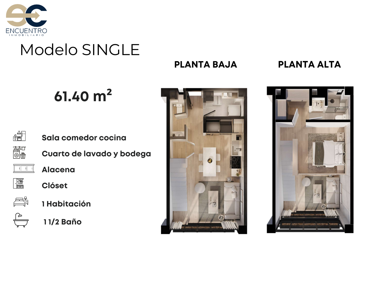 - Departamento de 1 recámara – Modelo Single con doble altura