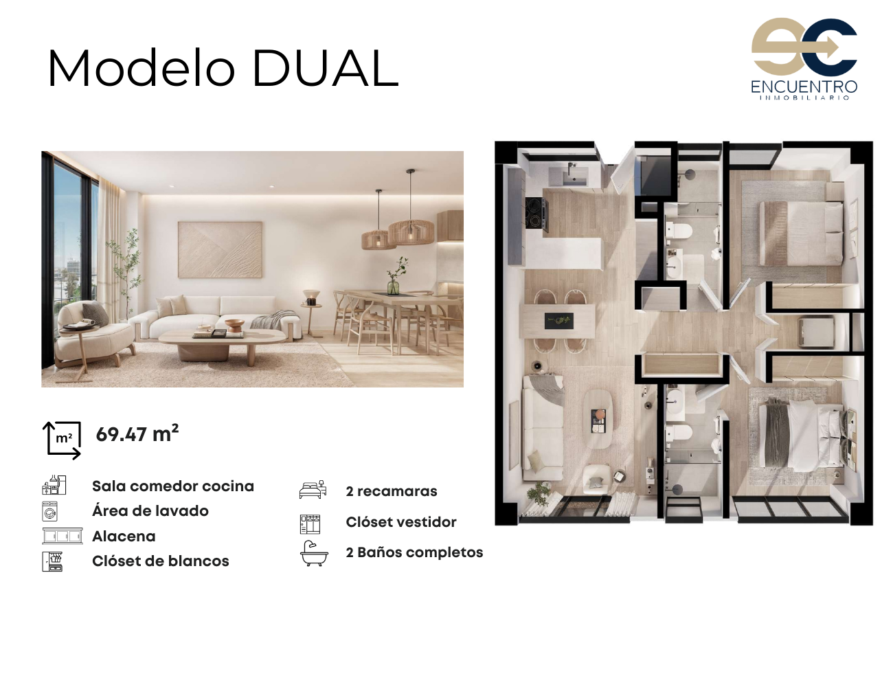 69.47 m²- 2 recámaras